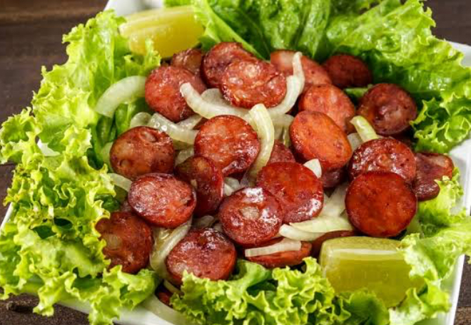 Calabresa suculenta grelhada, cebola dourada no ponto certo e muito sabor. Clássica e irresistível