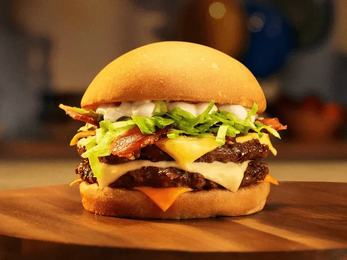 O 'Big Double' é uma esplêndida escolha na categoria 'Hamburguers'. Este prato é composto por dois generosos blends de 160g cada, cobertos com uma dupla camada de suculento cheddar. Para equilibrar, traz uma dupla porção de alface crocante, tudo acomodado em um pão de brioche com gergelim, delicadamente tostado. O toque especial fica por conta do nosso molho secreto e do cream cheese, que adicionam uma cremosidade irresistível. Para finalizar, uma pitada de cebola roxa, que traz um sabor agridoce e uma textura crocante. Uma experiência gastronômica única, repleta de sabores e texturas!